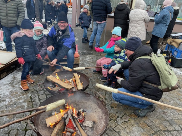Es gab wieder Stockbrot, gebrannte Mandeln, weihnachtliche Blockflöten- und Klavier-Musik (15.00–16.00 Uhr), Getränke und wärmendes Feuer sowie nette Gespräche.