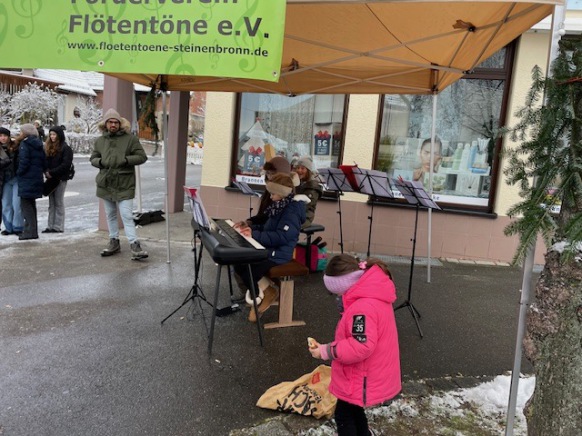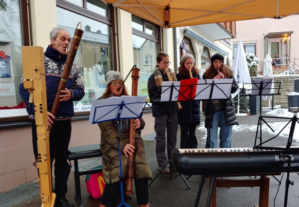 Ab drei Uhr konnte man – trotz immer wieder aufkommenden Windböen und eisiger Kälte – Weihnachtsliedermelodien lauschen, die das Ensemble der Flötentöne unter der Leitung von Josef Wagner mit den verschiedensten Blockflöten zu Gehör brachte. Auch wenn der Wind manchmal in die Schallöcher der Instrumente fuhr und die Musikantenfinger fast erstarren ließ, die Spieler und Spielerinnen hielten durch. Ebenso spielte der Wind mit den Schülerinnen der Klavierklasse Hanah Sivec-Park einen Schabernack und verwandelte die Tastenfinger fast schon in Eiszapfen und blies auch schon mal Notenblätter weg, aber tapfer hielten die Spielerinnen durch.