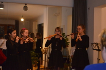 Für das anspruchsvolle Programm hatten sie ein ganzes Jahr mit ihrer tollen Lehrerin Daniela Schwierz gearbeitet. Und das hat sich gelohnt! Vielen Dank an Frau Schwierz! Die geforderten beiden Stücke für alte Musik bestritt das Quartett mit 2 Sätzen aus G. Ph. Telemanns Concerto F-Dur und dem Quartett in B mit dem 4. Satz „Gayment“. Schnelle Finger, sicheres rhythmisches Aufeinander-Eingehen und eine bestechend saubere Intonation ließen diese schöne, interessante Musik klangvoll den ganzen Raum erfüllen. Dann hieß es: Notenständer weg – in jede Hand eine bestimmte Flöte und los wirbelte Agnes Dorwarths modernes Stück: „Flauto Mortale“. Gekonnt und trotzdem locker und witzig, mit Stimme und Bewegung rissen die Spielerinnen das Publikum mit. Sogar die Jury, die sonst mit unbewegt objektiver Mine am Tisch saß, schmunzelte.
